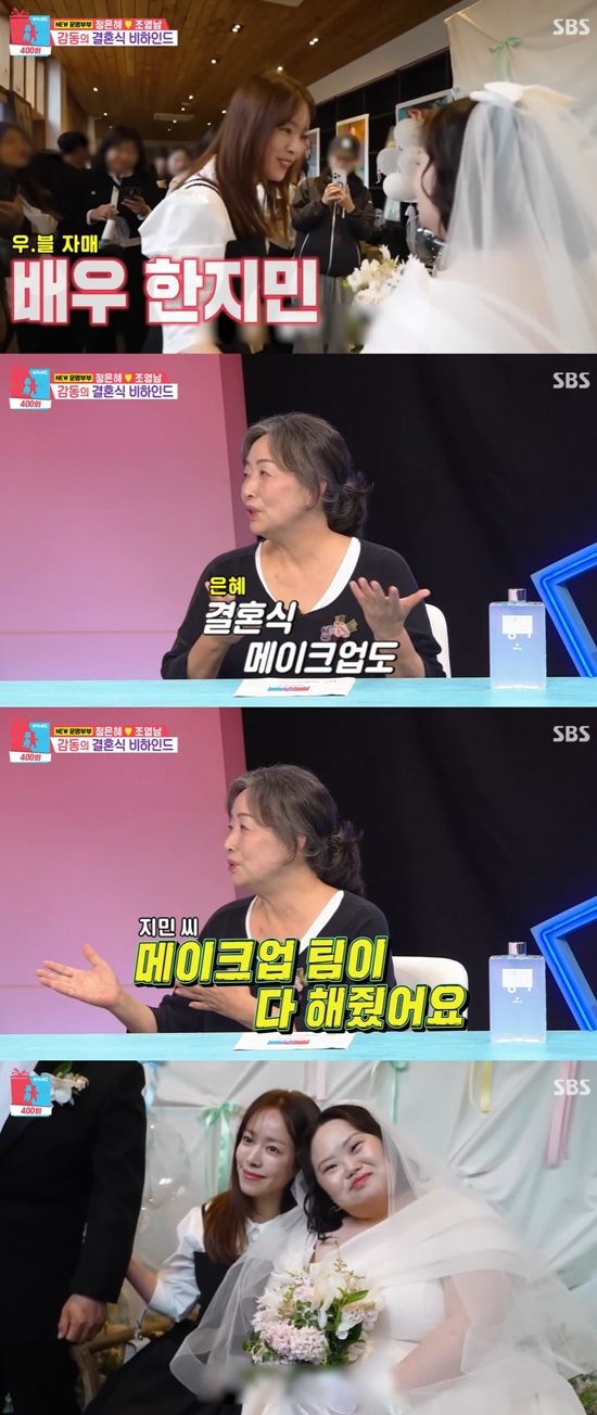두 사람의 결혼식 현장도 공개됐다. 한지민이 정은혜의 결혼을 축하하기 위해 한달음에 달려왔다. 정은혜의 모친은 "결혼식 메이크업을 지민 씨 메이크업 팀이 해줬다"라며 한지민의 미담을 공개했다.