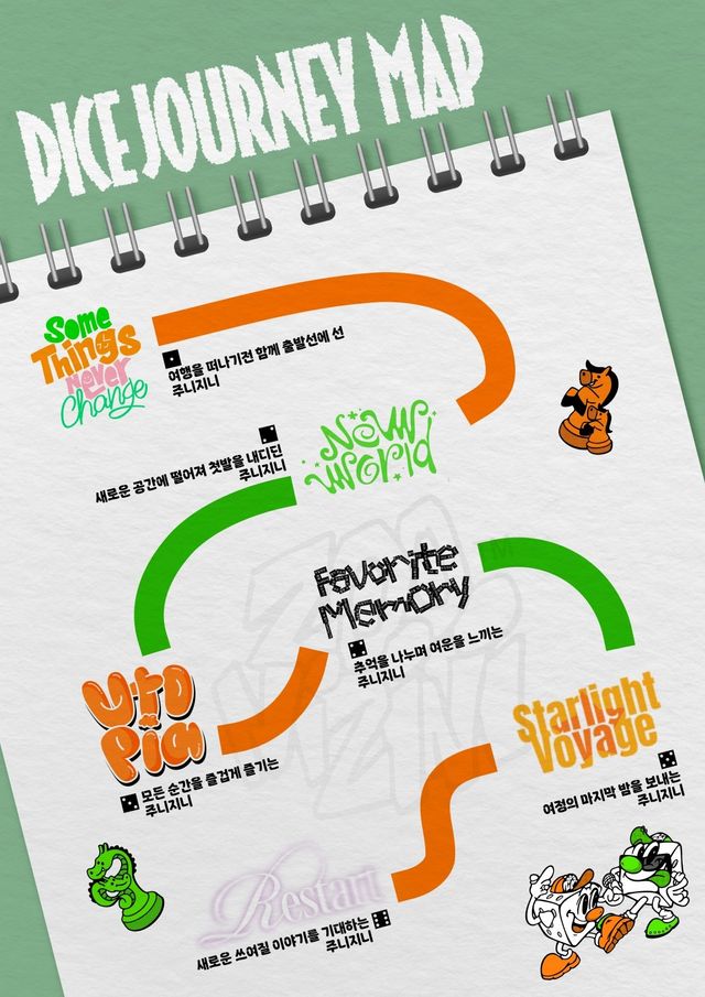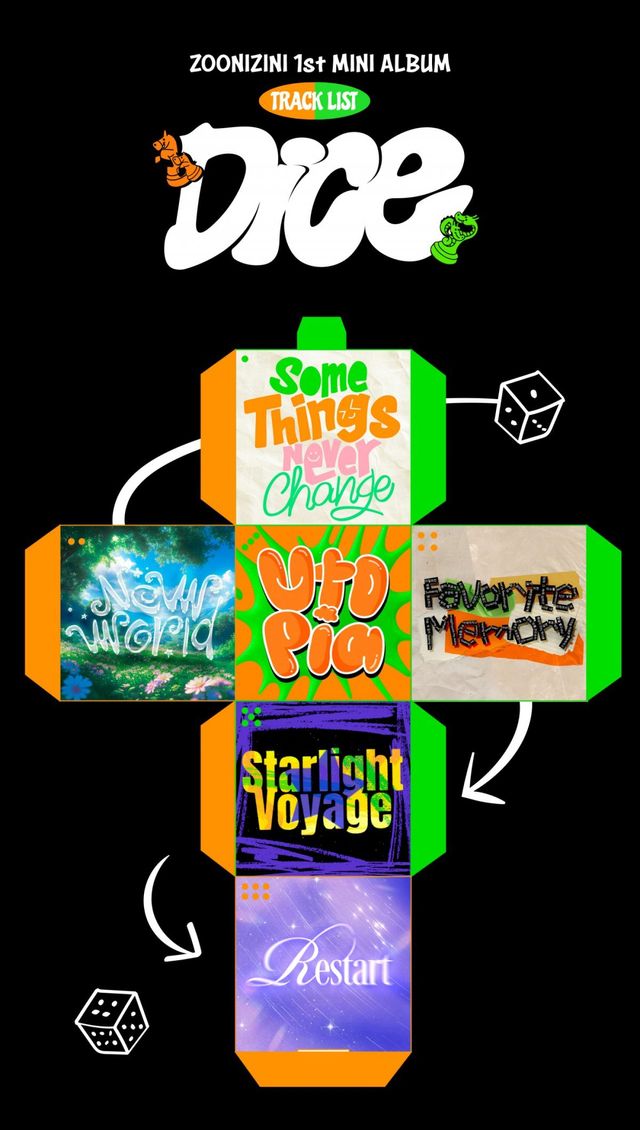 평면으로 펼쳐진 주사위의 여섯 면에는 주니지니의 이번 미니 1집 ‘DICE’에 수록되는 총 6곡의 트랙명이 각각 담겼다. 타이틀곡이자 1번 트랙인 ‘Some Things Never Change’(썸 띵스 네버 체인지)를 시작으로 ‘New world’(뉴 월드), ‘Utopia’(유토피아), ‘Favorite Memory’(페이버릿 메모리), ‘Starlight Voyage’(스타라이트 보이지), ‘Restart’(리스타트)까지 다채로운 곡명이 소개됐다.