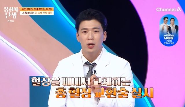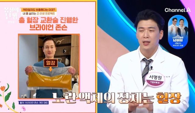 브라이언 존슨이 들고 있는 노란 액체의 정체는 혈장으로, 서명원 전문의는 “혈액에서 적혈구, 백혈구, 혈소판을 제거하고 남은 성분”이라고 설명했다. 전문의는 “노화를 막기 위해 연간 27억 원을 쓴다고 알려졌다. 젊음을 위해 다양한 방법을 쓰는데, 그중 하나로 혈장을 빼내서 교체하는 총 혈장 교환술을 실시한다. 독소, 염증 유발 물질을 제거하고 간에서 만들어지는 ‘이것’을 보충해서 다시 혈장으로 만들어 주입하는 거다”라고 전했다.