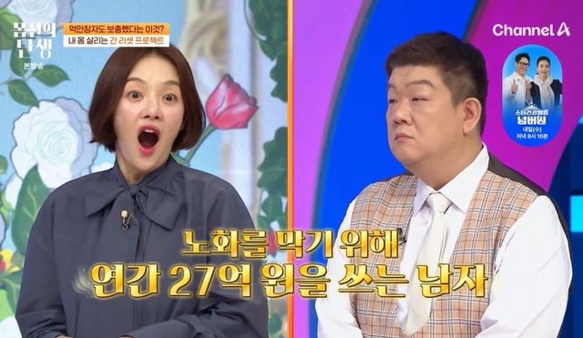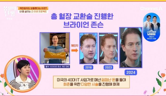 그런 가운데 미국의 억만장자인 IT 사업가 브라이언 존슨이 노화를 막기 위해 간에서 만들어지는 ‘이것’을 보충하는 시술을 시행했단 사실이 공개됐다. 사진이 공개되자 정은아는 “이 분 유명하다. 나날이 젊어지고 있다. 시간이 거꾸로 가고 있다”라고 밝혔다.