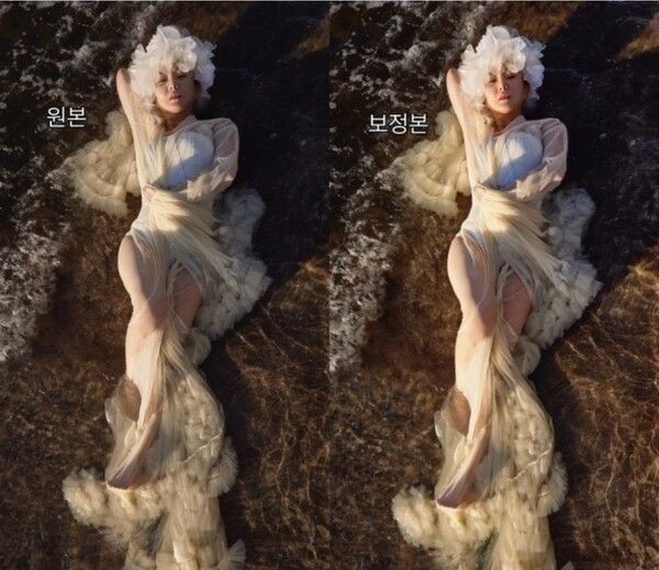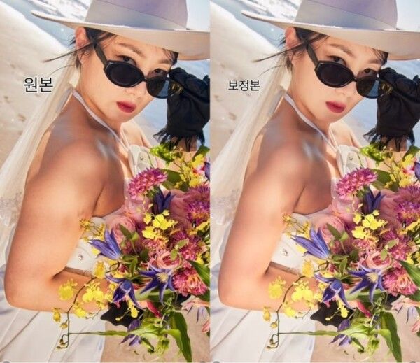 영상 속에서 원본 사진은 목선을 다듬거나 밝기를 키우는 등 기본적인 수정만 거쳤을 뿐, 보정 전후로 큰 차이가 없어 시선을 모았다. 해변에 누워있는 컷 역시 마찬가지였다. 이목구비가 또렷하게 보이도록 밝기와 색상만 조정되었고, 과도한 보정은 찾아볼 수 없었다.