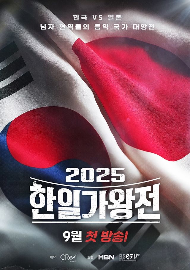이날 제작진은 ‘음악 한일전’ 서막을 알리는 ‘2025 한일가왕전’의 강렬한 티저 포스터를 공개해 기대감을 끌어올린다. ‘2025 한일가왕전’ 티저 포스터는 대한민국의 태극기와 일본의 일장기가 팽팽히 맞붙어 화면을 가득 채우고 있다. 이어 강렬한 서체로 새겨진 ‘2025 한일가왕전’과 불꽃 같은 붉은 글씨로 강조된 ‘9월 첫 방송’이라는 문구가 단번에 긴장감을 형성한다. ‘국가 간 자존심을 건 음악 대결’이라는 테마에 걸맞게, 단순한 경연을 넘어 문화적 자긍심과 음악적 정체성, 예술적 사명감이 충돌하는 대서사시 서막을 시각적으로 구현해 호기심을 높인다.