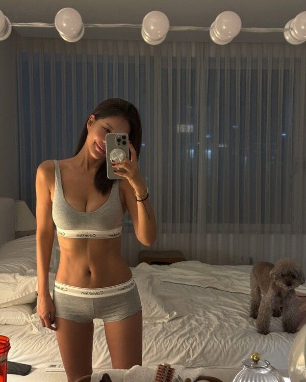 공개된 사진 속 김준희는 한 브랜드의 스포츠 속옷을 입고 거울 셀카를 찍고 있다. 군살 없는 글래머 몸매와 선명한 복근은 그녀의 꾸준한 운동 습관을 엿볼 수 있게 한다.