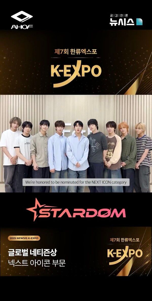 뉴시스 보도에 따르면, 신인 그룹 '아홉(AHOF)'은 4일 글로벌 팬덤 플랫폼 '스타덤(STARDOM)' 소셜 미디어에 올라온 영상에서 '제7회 뉴시스 한류엑스포'(2025 K-엑스포) '글로벌네티즌상'의 넥스트 아이콘 부문 우승자를 가리기 위한 최종전인 3라운드 후보에 오른 것과 관련 이렇게 소감을 밝혔다.