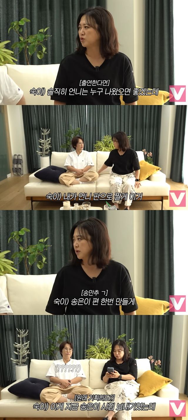 한창 '오만추'를 시청하던 김숙은 송은이에게 "솔직히 언니는 누구 나왔으면 좋겠냐"면서 "내가 언니 판으로 짜겠다. 제작비 얼마냐. 내가 대고 송은이 편 한번 만들겠다. 언니가 원하는 남자 딱 4명만 찍어라"라고 말했다.