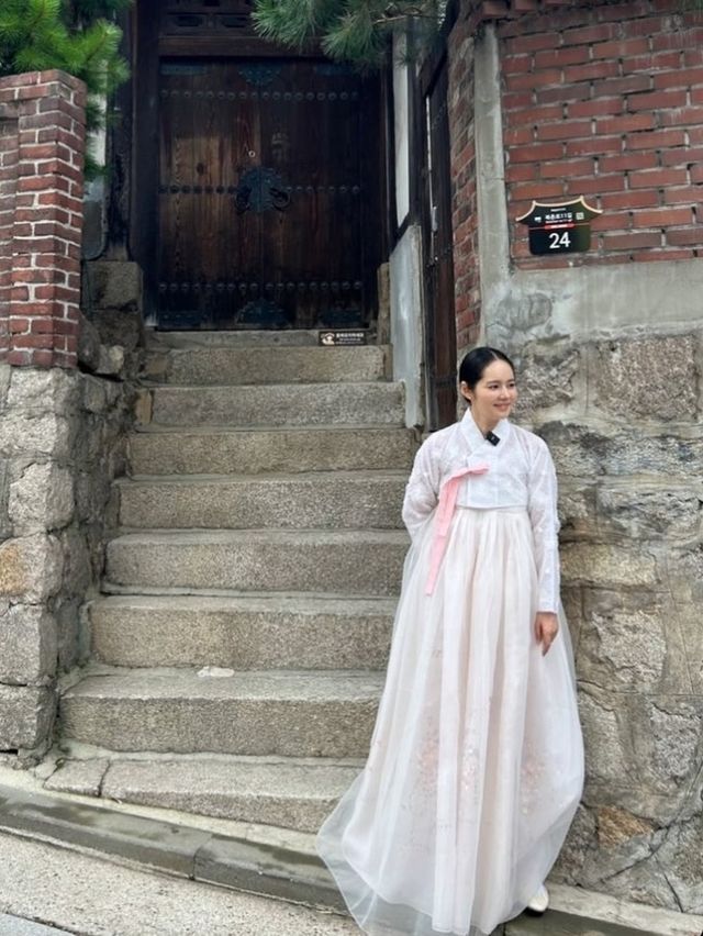 흰색 저고리와 연분홍 치마로 구성된 한복 차림이 조용하고 단정한 분위기를 더하며, 마치 시간이 멈춘 듯한 고요함을 자아낸다.