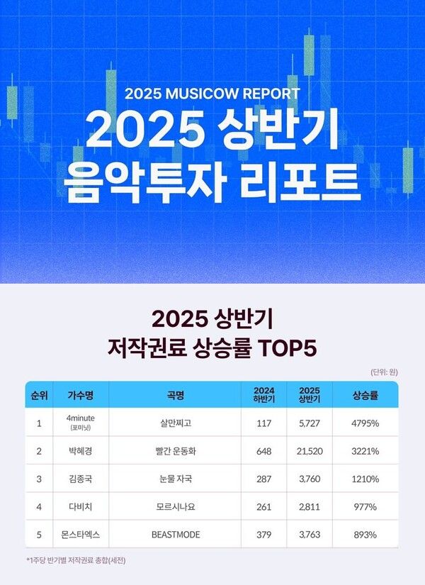 뉴시스 보도에 따르면, 뮤직카우는 6일 자사 웹머거진 채널 ‘뮤직카우노트’를 통해 2025년 상반기 음악투자 리포트를 공개했다.