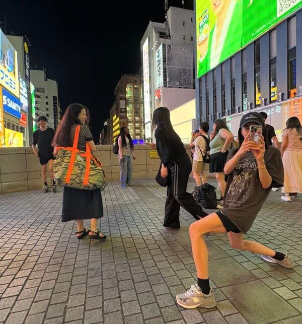 하지원은 일본 도쿄 거리에서 다리를 한껏 굽힌 채 사진 촬영을 했다.