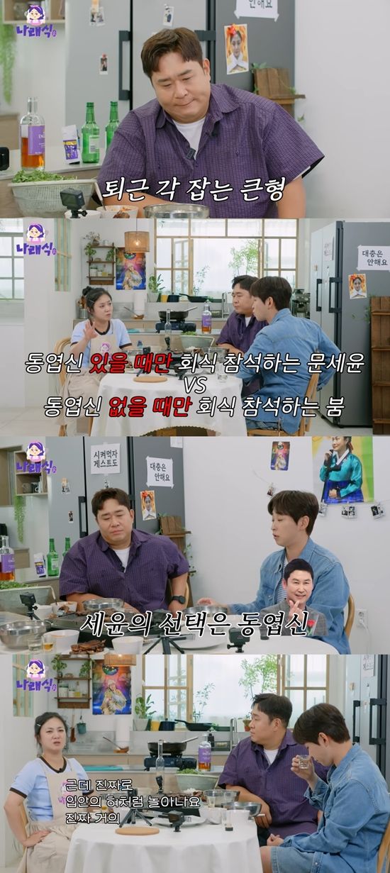 이에 박나래는 "우리가 그래서 '놀토'에서 찬반 토론을 한 적이 있다. '신동엽 선배 있을 때만 회식 참석하는 문세윤 VS 동엽 선배 없을 때만 참석하는 붐' 둘 중 누가 더 별로냐?"라고 딘딘에게 질문했다.