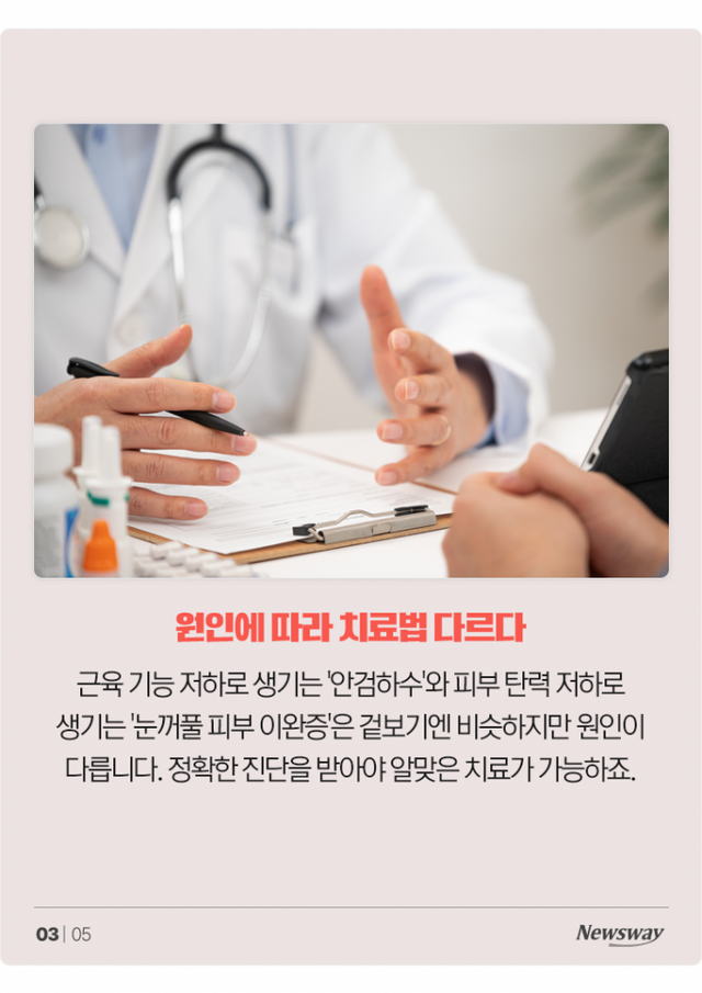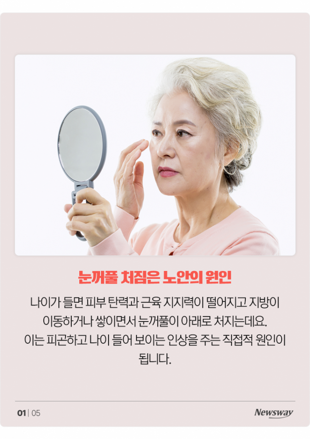 나이가 들면 피부 탄력과 근육의 지지력이 떨어지고, 지방층이 이동하거나 축적되면서 눈 주변 피부가 아래로 처지는 현상이 발생하게 된다. 눈꺼풀이 아래로 처지게 되면 겉으로 보기에도 피곤하고 나이 들어 보이는 인상을 줄 수 있다.