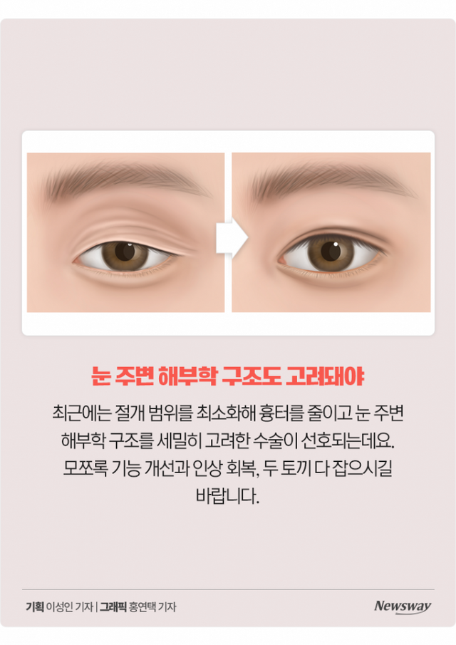 최근에는 회복이 빠르고 흉터가 최소화될 수 있도록 절개 범위를 최소화하는 방식이나, 눈 주변 해부학적 구조를 세밀하게 고려한 수술이 활발히 이뤄지고 있다. 이러한 치료를 받을 경우 기능 개선과 더불어 자연스러운 인상 회복을 기대할 수 있다.