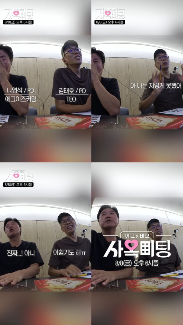 이어 에그X테오 '사옥미팅'이라는 새 콘텐츠가 공개된다. 나영석 PD의 에그이즈커밍과 김태호 PD의 TEO 소속 직원들의 '연애 프로그램' 형식의 영상이 기대를 모은다.