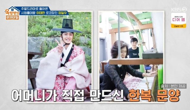 송은이는 “옷방이 2개라는데 그럴 만하다”라며 정일우 가족의 이력에 대해 밝혔다. 어머니는 고대직물연구소 소장, 아버지는 교수, 누나는 패션 디자이너라고. 정일우는 “어머니가 문화재 위원이다. 중국에서 박사 학위를 따셨다. 무형 문화재, 인간문화재를 선정하는 우리나라 일곱 분의 문화재 위원이 계시는데, 그분 중 한 분”이라고 소개했다.