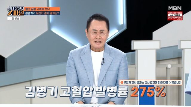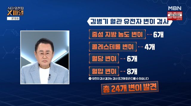 질병 유전자 변이 검사 결과, 김병기에게는 △중성 지방 농도 변이 △콜레스테롤 변이 △혈당 변이 △혈압 변이 등 총 24개의 유전자 변이가 발견됐다. 박주홍 박사는 “혈관 쓰리고가 잘 발생할 수 있는 상태”라며 “고혈압 발병률은 275%로 아주 높다. 지금 건강하다고 안심하면 안 된다는 의미”라고 말했다.
