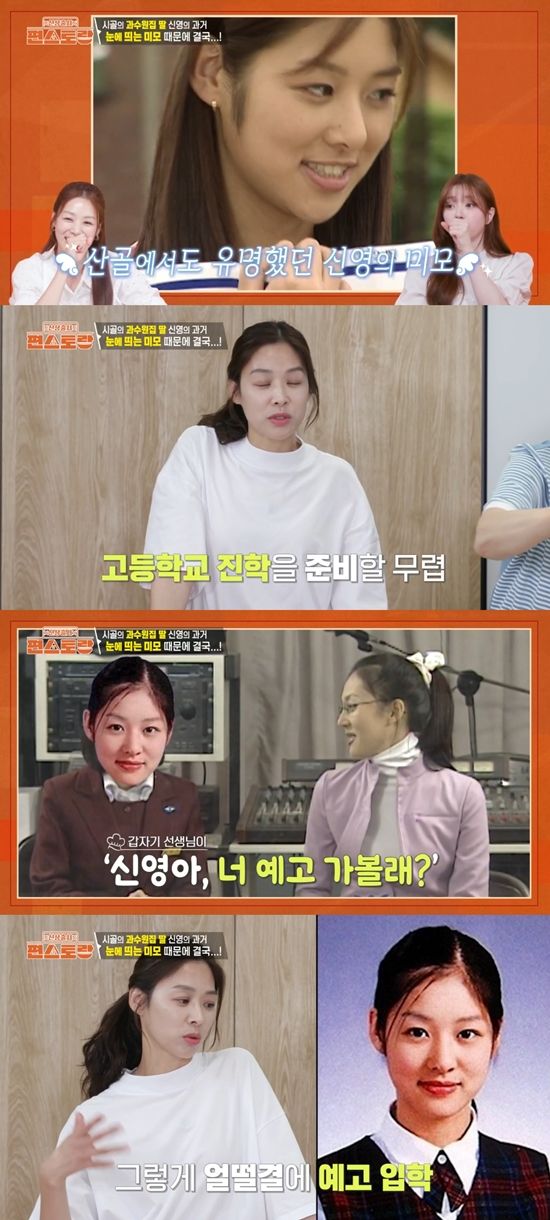 장신영은 "중학교 3학년 때 고등학교를 들어가야 되는데, 갑자기 중학교 선생님이 나한테 예고를 가라고 했다. '예고가 뭔데요?'라고 했다"라고 밝혔다. 이에 붐은 "선생님들이 알아보신 거다"라고 말했고, 한해는 "세상이 가만두지 않지"라고 덧붙였다.