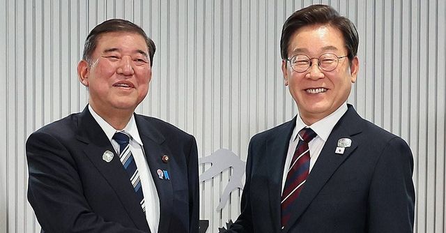 이재명 대통령이 지난 6월 17일(현지시간) 캐나다 앨버타주 캐내내스키스 주요 7개국(G7) 정상회의장에서 열린 한일 정상회담에서 이시바 시게루 일본 총리와 악수하며 기념촬영을 하고 있다 / 연합뉴스
