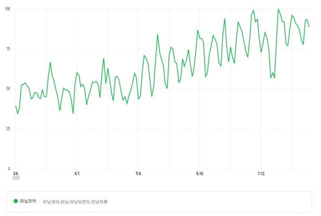 네이버 검색어 트렌드에 따르면 지난 6개월 간 '러닝코어'(러닝, 러닝브랜드, 러닝의류 등) 키워드 검색량은 꾸준히 증가해 지난달 21일에는 해당 기간 중 가장 높은 수치인 100을 기록했다.