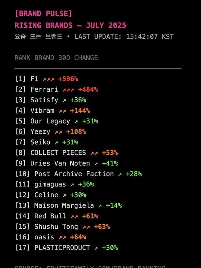 150만 명이 사용하는 패션 중고거래 어플 후르츠 패밀리에 따르면 지난 7월 'F1' 키워드 검색량은 596%나 증가했으며, '페라리' 키워드 검색량은 484%나 증가한 수치다.