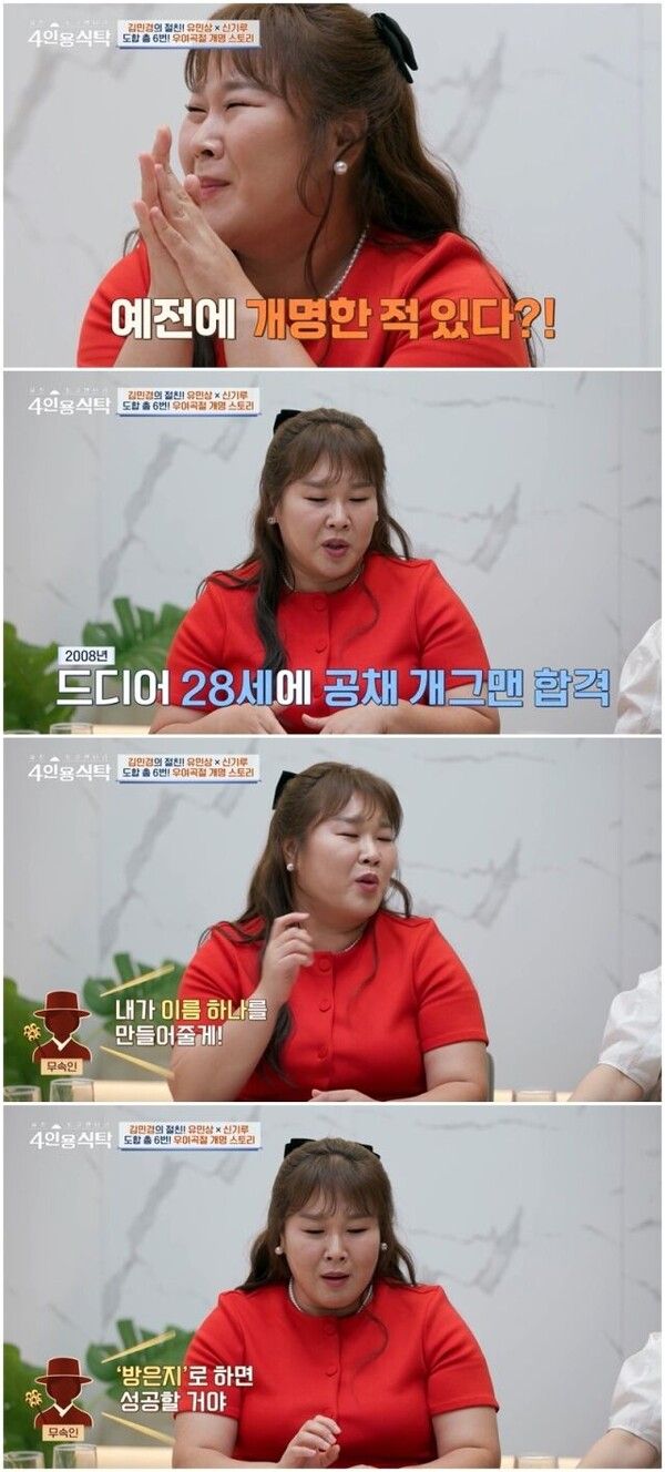 이날 김민경은 “21살에 서울에 올라와 개그맨이 안됐다가 2008년 개그맨이 됐는데 또 아무 것도 못하고 대기실만 지키고 있었다”고 힘든 과거를 회상했다. 이어 “너무 힘든 시기였는데 아는 무속인 언니가 이름 하나 만들어주겠다면서 ‘방은지’라는 이름을 줬다”고 개명하게 된 이유를 밝혔다.