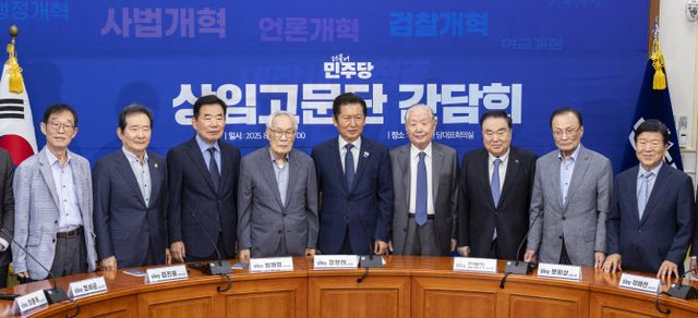 이날 간담회에서 원로들은 정 대표에게 정책적 조언도 건넸다. 김진표 전 의장은 대미 투자 확대에 따른 국내 제조업 공동화 우려를 지적하며 “ 우리 제조업이 공동화되는 것 아니냐는 걱정과 우려를 해소시킬 수 있는 종합적인 대책, 특히 특별 입법이 반드시 필요하다고 생각한다”고 말했다. 그러면서 지방산업단지에 대한 재정·금융·세제지원과 규제 완화를 언급했다. 이해찬 전 대표는 “정부·여당의 협의는 굉장히 총체적이고 종합적이어야 한다”며 “하나도 따져보지도 않고 뚝딱 하고 내놓는 정책이 또 나와서는 안 되기 때문에 당·정·청 간에 긴밀하게 협의를 해서 좋은 정책을 만들어 주기를 특히 대표가 적극적으로 나서서 해야 한다”고 말했다.