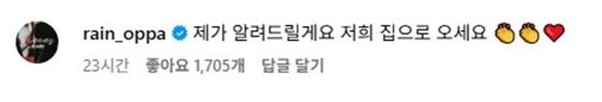 이에 비가 직접 김태희의 SNS에 등장해 "제가 알려드릴게요. 저희 집으로 오세요"라고 너스레를 떨며 댓글을 남겨 유쾌함을 자아냈다.