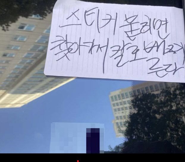 A씨는 지난달 28일 오전 4시 30분께 광주 서구 화정동 한 아파트 단지에 불법 주차한 자신의 차량 유리창에 “스티커 붙이면 찾아가서 흉기로 배 찌른다”는 메모를 부착한 혐의를 받는다.