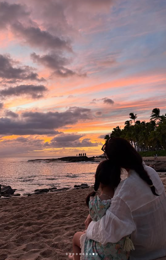 다른 사진 속엔 해변가의 모래 위에서 마주 앉아 바다를 바라보는 모녀의 뒷모습이 담겼다. 파스텔빛으로 번져가는 하늘과 잔잔한 파도 소리가 들리는 듯한 장면이었다. 최지우는 딸을 꼭 끌어안고, 딸은 엄마 품에서 세상 가장 편안한 표정을 짓고 있었다.
