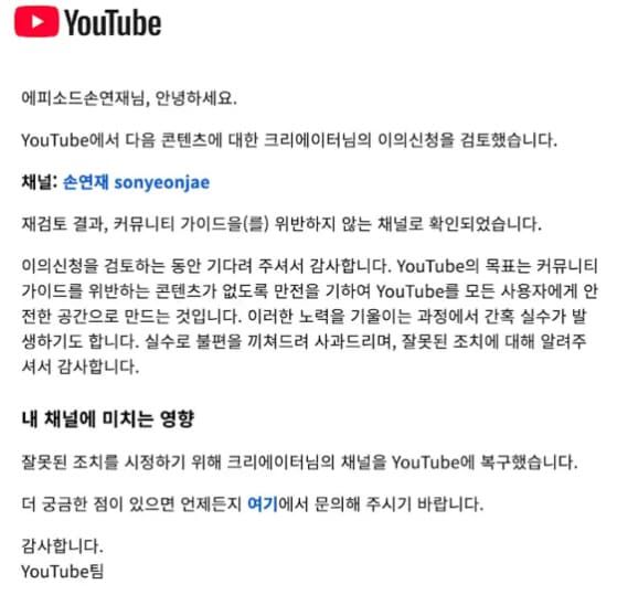 지난 11일 손연재의 개인 유튜브 채널이 '접속 불가' 상태로 폐쇄됐던 가운데 '커뮤니티 가이드를 위반했다'는 채널 삭제 안내문까지 등장했습니다. 그러나 제작진의 이의신청 결과 가이드 위반 사항은 없었고, 유튜브 측의 알고리즘에 오류가 있던 것입니다.