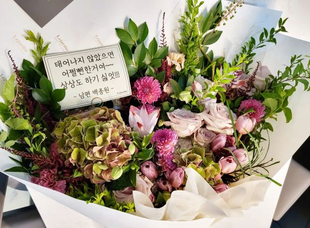 2022년에 준비한 꽃다발에는 "이쁜 와이프 낳아주셔서 장모님 감사합니다"라는 문구로 사위 노릇까지 톡톡히 했다.