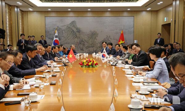 그러면서 "이렇게 고위급 교류가 활발하게 이뤄지고 있는게 앞으로 양국간 발전에 더 크게 발전해갈 거라는 확신을 준다"며 "(오늘은) 당 서기장이 방한했고, 오는 10월 말 경주에서 다시 만나게 되면 그 때(APEC 정상회의)는 베트남 국가주석 참여하는 것으로 아는데 이렇게 (양국 간) 활발하게 교류 이뤄지는 건 참으로 크게 기대되는 바"라고 강조했다.