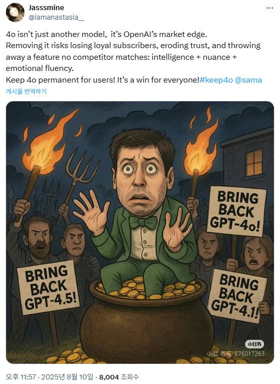 12일 미국 최대 온라인 커뮤니티 레딧과 엑스(X), 스레드 등 소셜미디어(SNS)에는 GPT-4o 부활을 요구하는 서명 운동과 함께 keep4o(4o를 돌려줘)라는 해시테그가 확산되고 있다.