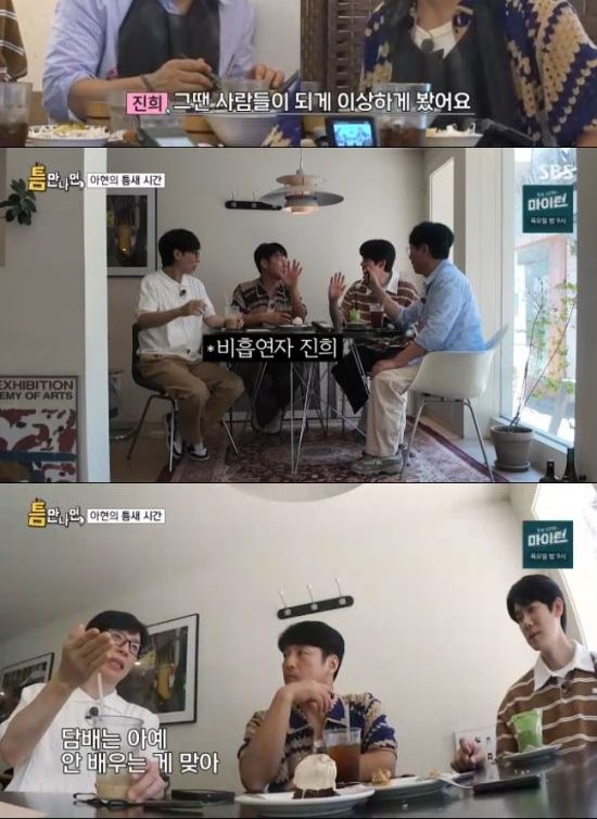 또 흡연에 대한 이야기를 나누면서 유재석은 "담배는 처음에 안 배우는 것이 맞다"면서 옛날에는 비행기, 버스, 극장에서도 흡연이 가능했다면서 "지금 생각하면 상상도 할 수 없는 일이다. 지금보면 그 때는 '야만의 시대'"라고 말해 공감을 유발했다.