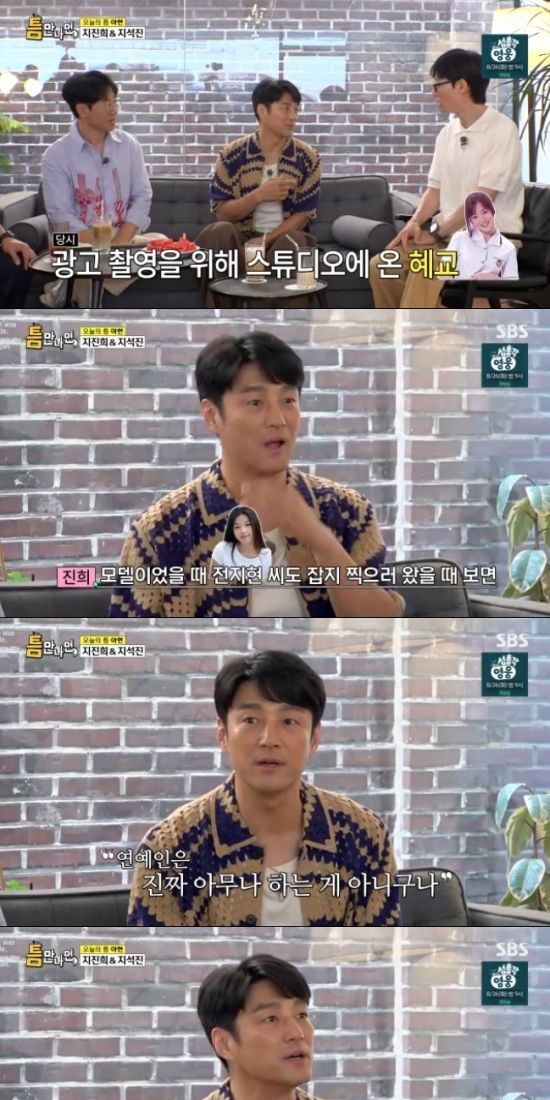 지진희는 "당시에 제가 일하던 스튜디오에 중학생이었던 송혜교 씨가 광고 촬영을 위해 왔었다. 정말 예쁘더라. '연예인은 아무나 하는 거 아니구나'라는 생각이 들었다. 그리고 전지현 씨도 잡지 촬영 때문에 왔는데 '이게 사람이야?' 싶었다"고 충격적이었던 송혜교와 전지현의 실물을 언급했다.