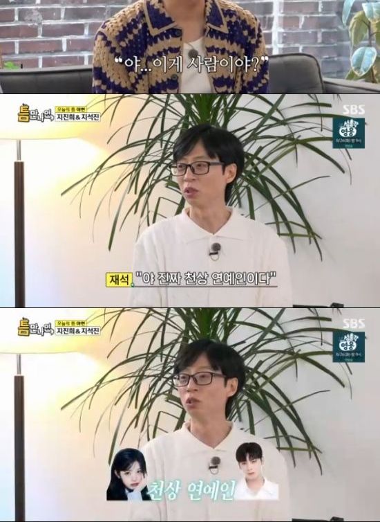 이를 들은 유재석은 "맞다. 같은 동료인데 진짜 '천상 연예인'이라고 생각이 드는 사람이 있다. 요즘엔 장원영, 차은우 씨가 그런 것 같다"고 말했다. 그러자 지석진은 유재석에게 "너는 참, 어쩌다 연예인이 됐니?"라면서 갑자기 돌직구를 날렸다.