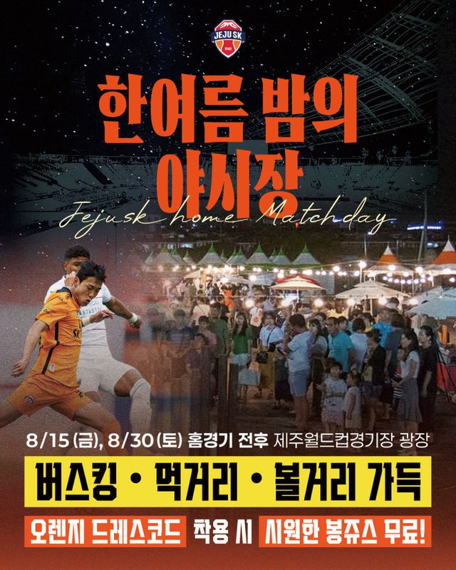 제주 관계자는 "새로운 경험이 주는 추억의 힘은 강렬하다. 이번 제주SK와 함께하는 ‘한여름 밤의 야시장’을 통해 축구를 통한 많은 팬들이 제주의 밤이 더욱 깊고 풍성해지는 특별한 추억을 쌓길 바란다"라고 전했다.