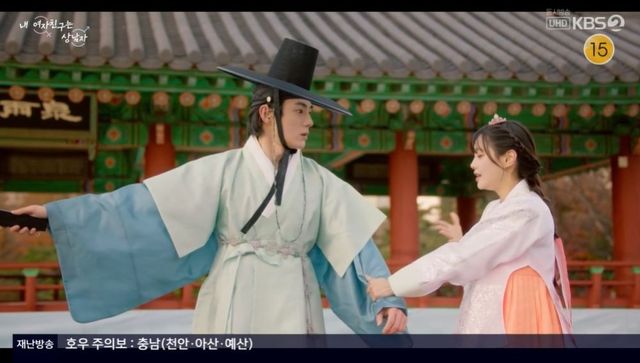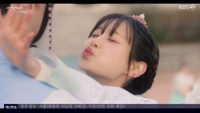 이후 같이 한복을 입고 아르바이트를 하게 된 강민주와 김지훈. 박윤재가 온단 말에 김지훈은 “나 지금 완전 도령인데 부르면 어떡해”라며 서둘러 빠져나갔다. 강민주는 어쩔 수 없이 박윤재와 함께 무대에 섰다. 포옹에 이어 입술에 뽀뽀하란 지시가 내려왔다. 강민주가 입을 내민 그때 차마 두 사람의 뽀뽀를 볼 수 없는 김지훈이 “멈춰라”면서 무대에 난입했다. 강민주와 김지훈은 즉석 상황극을 시작했다.