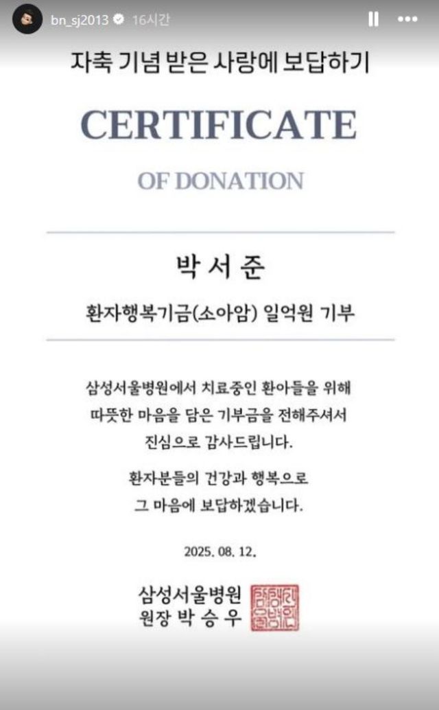이와 함께 그는 SNS 계정 스토리에 "자축 기념 받은 사랑에 보답하기"라는 문구와 함께 기부증서를 공개했다. 공개된 내용에 따르면 박서준은 소아암 치료를 받고 있는 환아들을 위해 삼성서울병원에 환자행복기금(소아암) 1억 원을 전달했다.