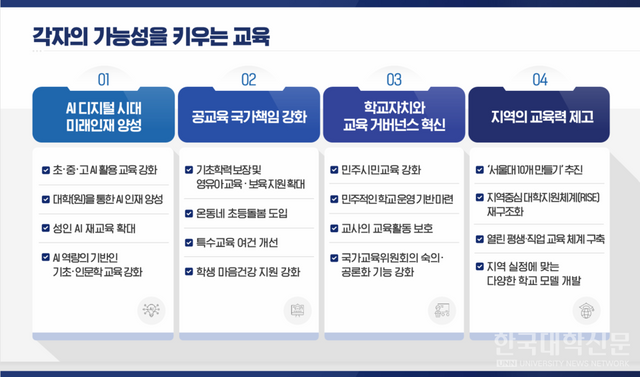 이날 발표된 ‘국정운영 5개년 계획(안)’에서 교육과 관련된 국정과제는 총 5개로, ‘자치분권 기반의 균형성장’ 전략에 포함된 △지역교육 혁신을 통한 지역인재 양성 1개 과제와 ‘각자의 가능성을 키우는 교육’ 전략에 포함된 △AI 디지털시대 미래인재 양성 △시민교육 강화로 전인적 역량 함양 △교육격차 해소를 위한 공교육 강화 △학교자치와 교육 거버넌스 혁신 4개 과제다.