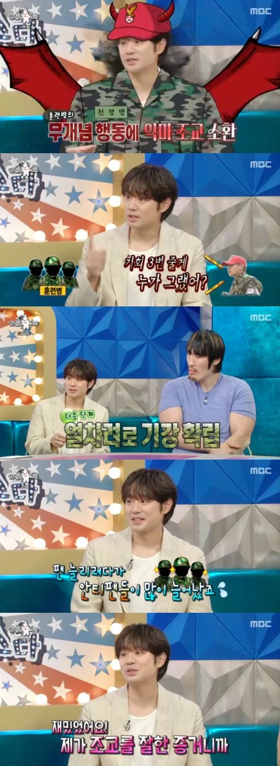또 이날 천정명은 군대에서 '악마조교'로 불렸던 당시를 회상했다. 천정명은 "저는 악마조교가 될 생각이 없었다. 천사조교가 되려고 했는데, 많은 사람을 통제해야하니까 어쩔 수 없이 그렇게 되더라"고 했다.
