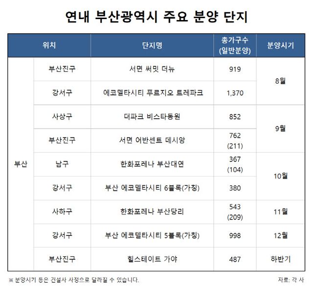 같은 달 태영건설은 부산진구에 ‘서면 어반센트 데시앙’을 762가구(일반분양 211가구)를 공급한다. 한화건설부문은 부산 남구에 ‘한화포레나 부산대연’ 367가구(일반분양 104가구)를 10월 공급한다. 11월에는 ‘한화포레나 부산당리’ 543가구(일반분양 209가구)도 예정돼 있다. 현대건설은 하반기 부산진구 가야동에서 ‘힐스테이트 가야’ 487가구도 분양 예정이다.