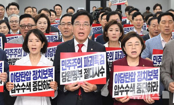 뉴시스 보도에 따르면, 국민의힘 의원들이 14일 열린 의원총회에서 특검의 당원명부 요구를 집중 규탄했다.