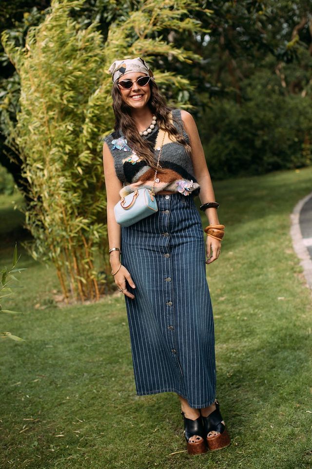 스트라이프 패턴의 롱 데님 스커트를 중심으로 머리부터 발끝까지 보헤미안 무드를 한껏 살린 룩도 더없이 유쾌합니다. 니트 베스트와 패턴 스카프, 볼드한 액세서리 그리고 플랫폼 샌들까지, 서로 다른 독특함이 만나 조화롭게 어우러졌죠. 룩 하나로 기분 전환이 필요한 날 활용하기에 제격이겠군요!