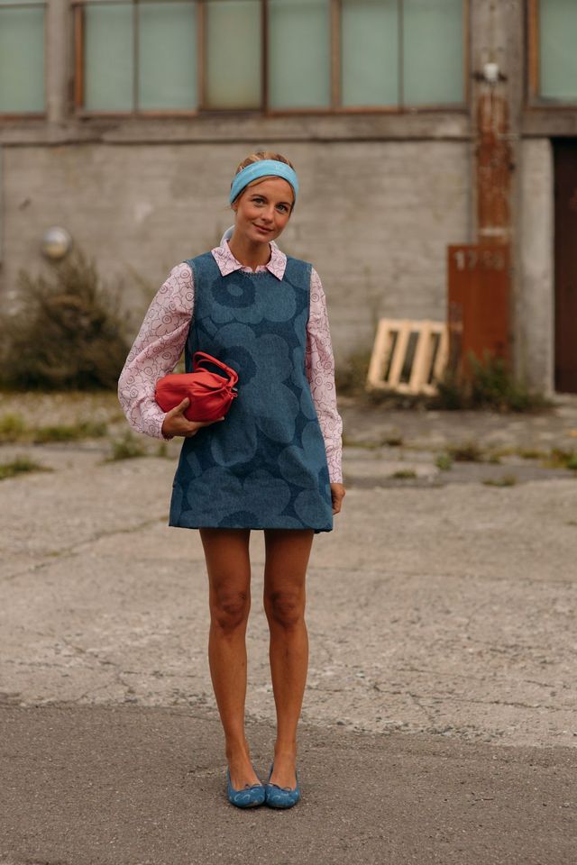 커다란 플라워 패턴의 핑크 셔츠 위에 데님 미니드레스를 입고, 머리부터 발끝까지 파스텔 블루와 레드로 톤 온 톤, 컬러 포인트를 동시에 챙긴 룩이네요. 사랑스러운 소녀 감성과 대담한 컬러 조합이 만나니, 평범한 데님도 이토록 앙증맞게 변신할 수 있군요.