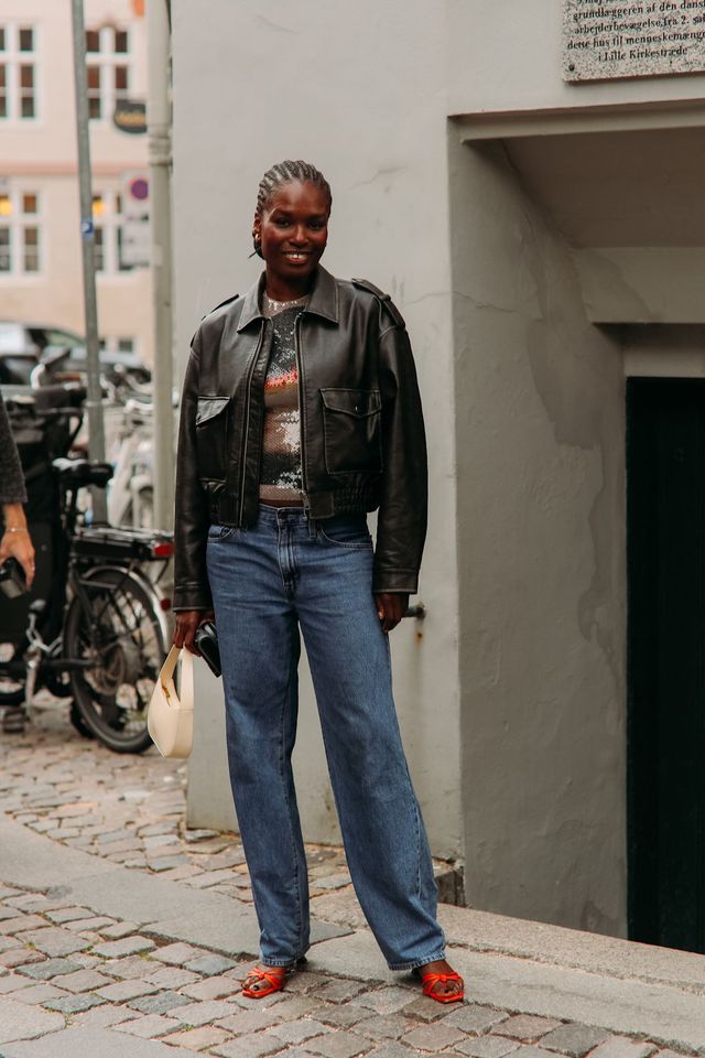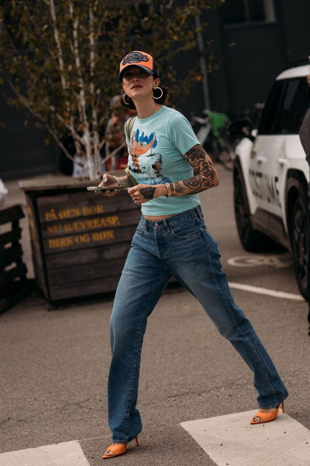 데님을 배경지처럼 활용하는 법도 있습니다. 하나는 그래픽 티셔츠와 컬러 힐, 또 하나는 레더 재킷과 프린트 티셔츠에 레드 슈즈로 마무리한 룩의 공통점은 무엇일까요? 바로 기본 데님 팬츠를 표정 있는 상의로 변주했다는 점이죠. 톡톡 튀는 프린트와 베이스볼 캡으로 자유분방함을, 시크한레더와 대담한 컬러 포인트로 당당함을 더했군요.