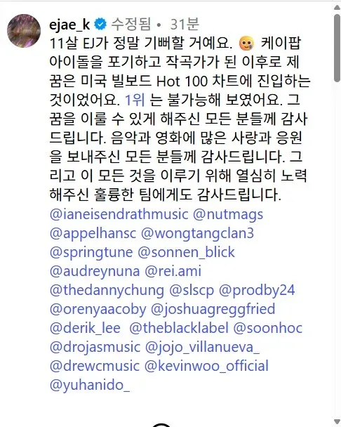작곡가로 빌보드 100위 넣는 게 꿈이었다가