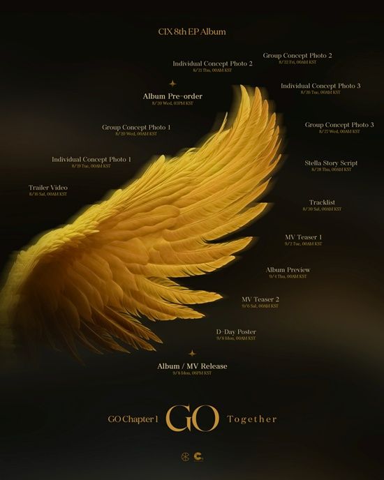 CIX는 컴백에 앞서 오는 16일 트레일러 비디오 공개를 시작으로 연일 개인 및 그룹 콘셉트 포토 세 가지 버전, 스텔라 스토리 스크립트, 트랙리스트, 뮤직비디오 티저 두 편, 앨범 프리뷰 등 다양한 티징 콘텐츠를 선보인다. 이 가운데 스텔라 스토리 스크립트는 의미심장한 티저 제목만으로 'GO Chapter 1 : GO Together' 속 스토리텔링을 향한 궁금증을 더한다.