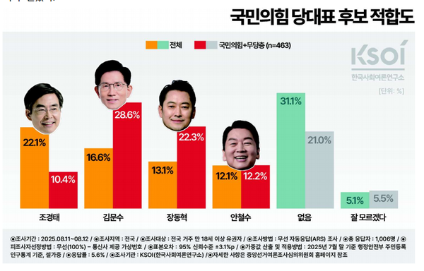 한국사회여론연구소(KSOI)가 11~12일 양일간 전국 18세 이상 성인 1006명을 대상으로 국민의힘 차기 당대표로 누가 가장 적합한지 물은 결과 조경태 22.1%, 김문수 16.6%, 장동혁 13.1%, 안철수 12.1%로 집계됐다.