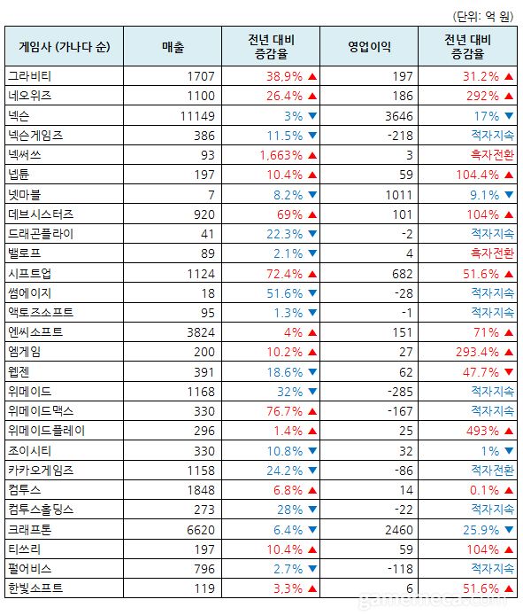 ▲ 게임 상장사 2025년 2분기 실적 (자료출처: 전자공시 및 각 회사 IR 페이지)