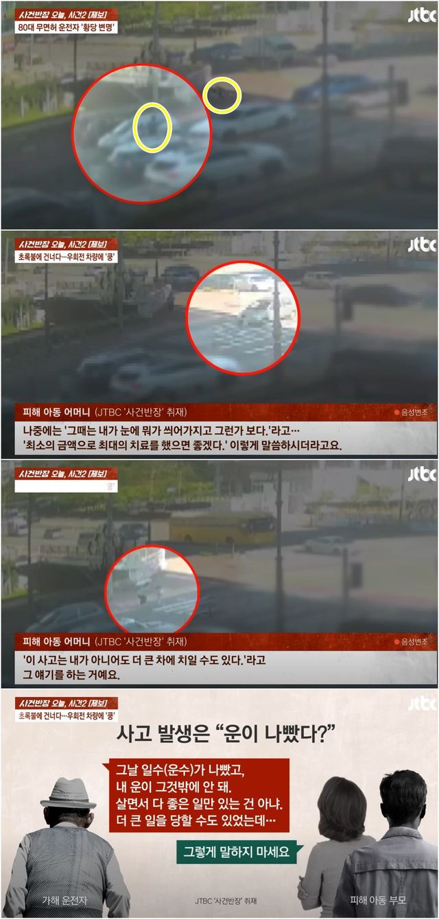 가해자는 A 씨에게 "팔십 평생 이런 일은 처음이다. 잘못했다"며 사과했지만, 이어 "운이 나빴다. 내가 아니어도 아이는 더 큰 차에 치였을 수도 있다"는 태도를 보이기도 했다. 또 "최소의 금액으로 최대한 치료하길 바란다"고 말해 A 씨의 분노를 샀다.