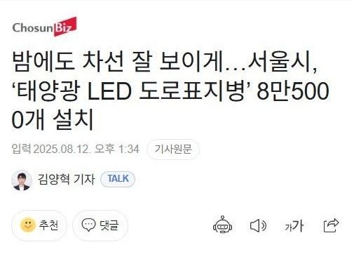 출처 밤에도 차선 잘 보이게…서울시, ‘태양광 LED 도로표지병’ 8만5000개 설치 - 조선비즈